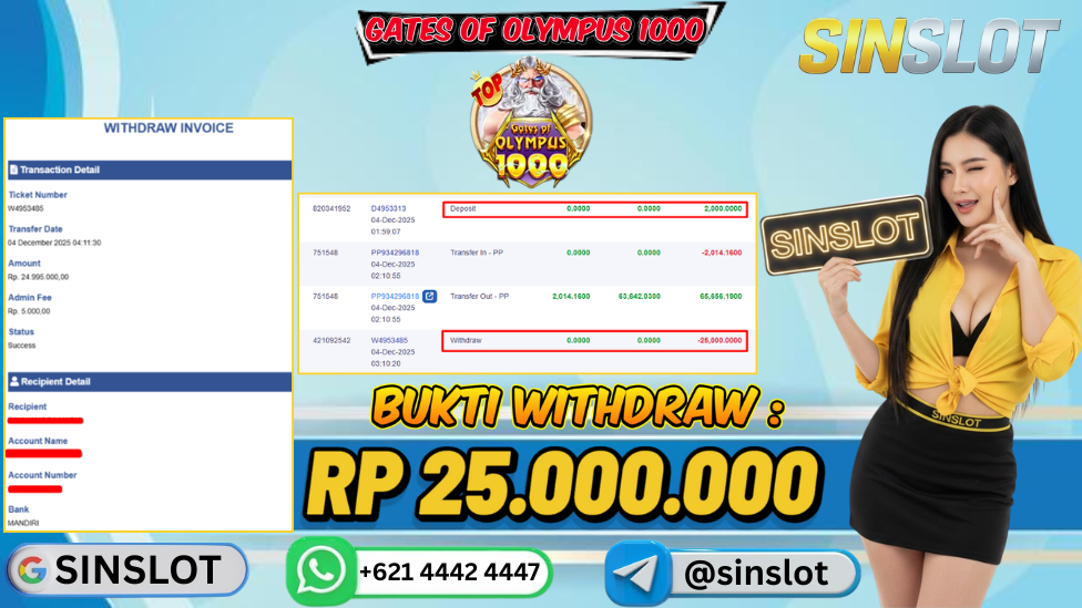 Kabar kemenangan besar kembali menggema dari dunia Slot online, ketika seorang member SINSLOT berhasil meraih payout spektakuler sebesar Rp 25.000.000,- pada 04 Desember 2025. Tidak hanya menang besar, tetapi kemenangan ini langsung LUNAS 100% tanpa potongan dan cair hanya dalam hitungan menit.