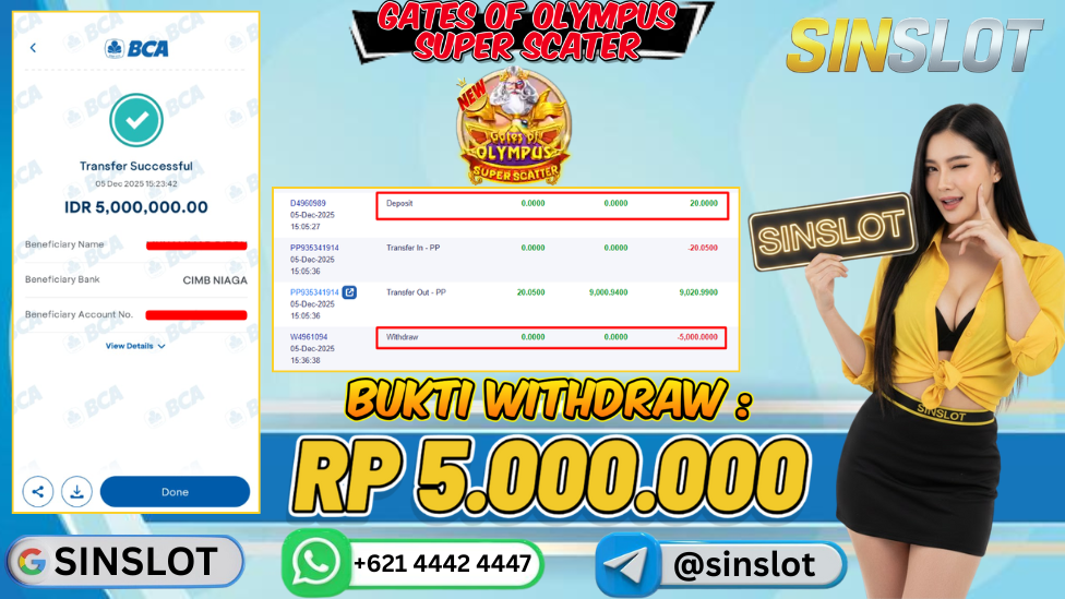 Kabar kemenangan besar kembali menggema dari dunia Slot online, ketika seorang member SINSLOT berhasil meraih payout spektakuler sebesar Rp 5.000.000,- pada 05 Desember 2025. Tidak hanya menang besar, tetapi kemenangan ini langsung LUNAS 100% tanpa potongan dan cair hanya dalam hitungan menit.