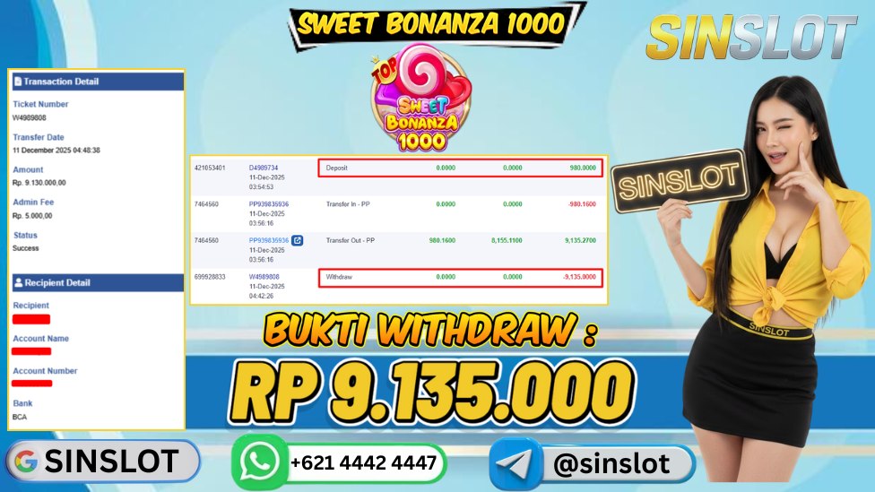 Kabar kemenangan besar kembali menggema dari dunia Slot online, ketika seorang member SINSLOT berhasil meraih payout spektakuler sebesar Rp 9.135.000,- pada 11 Desember 2025. Tidak hanya menang besar, tetapi kemenangan ini langsung LUNAS 100% tanpa potongan dan cair hanya dalam hitungan menit.