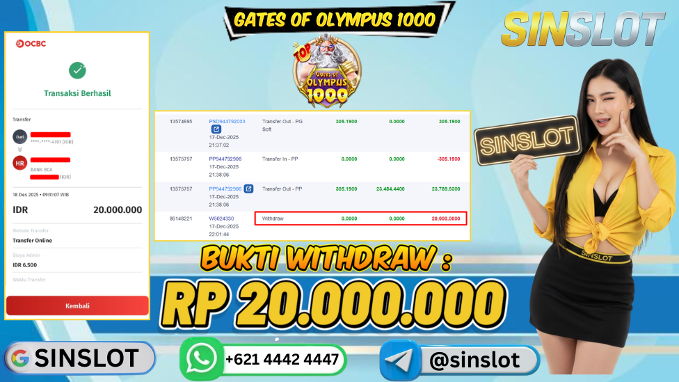Kabar kemenangan besar kembali menggema dari dunia Slot online, ketika seorang member SINSLOT berhasil meraih payout spektakuler sebesar Rp 20.000.000,- pada 18 Desember 2025. Tidak hanya menang besar, tetapi kemenangan ini langsung LUNAS 100% tanpa potongan dan cair hanya dalam hitungan menit.